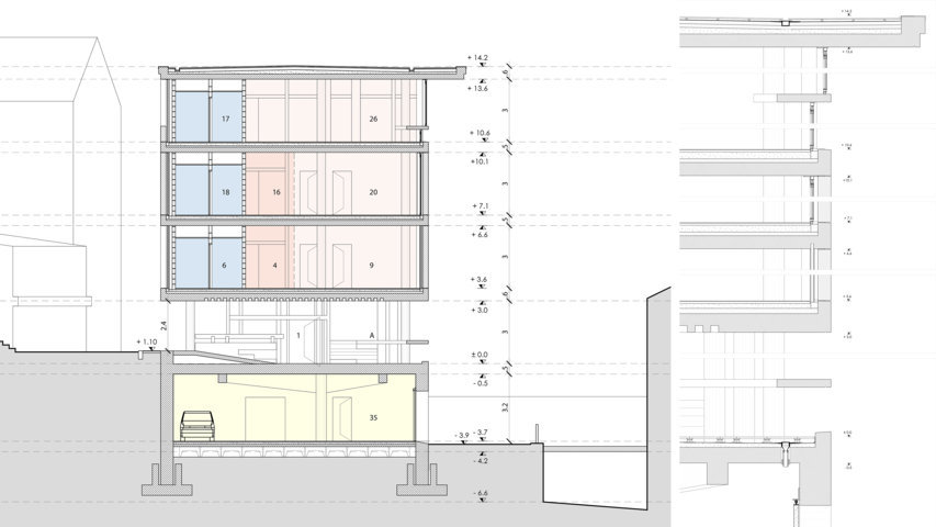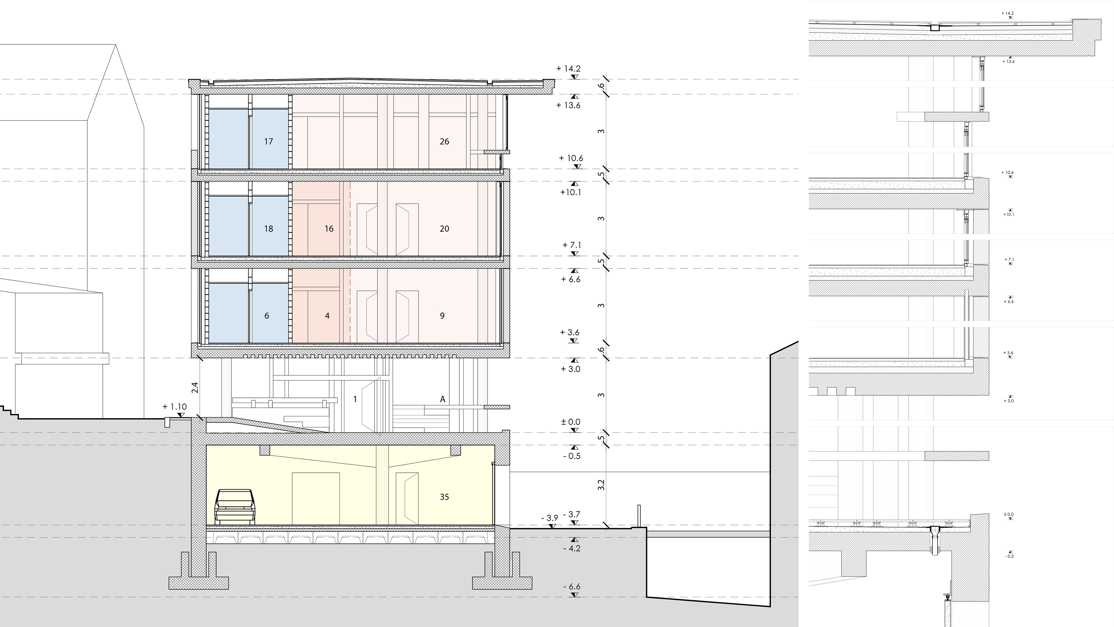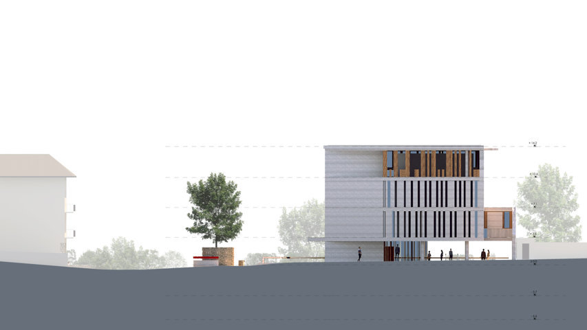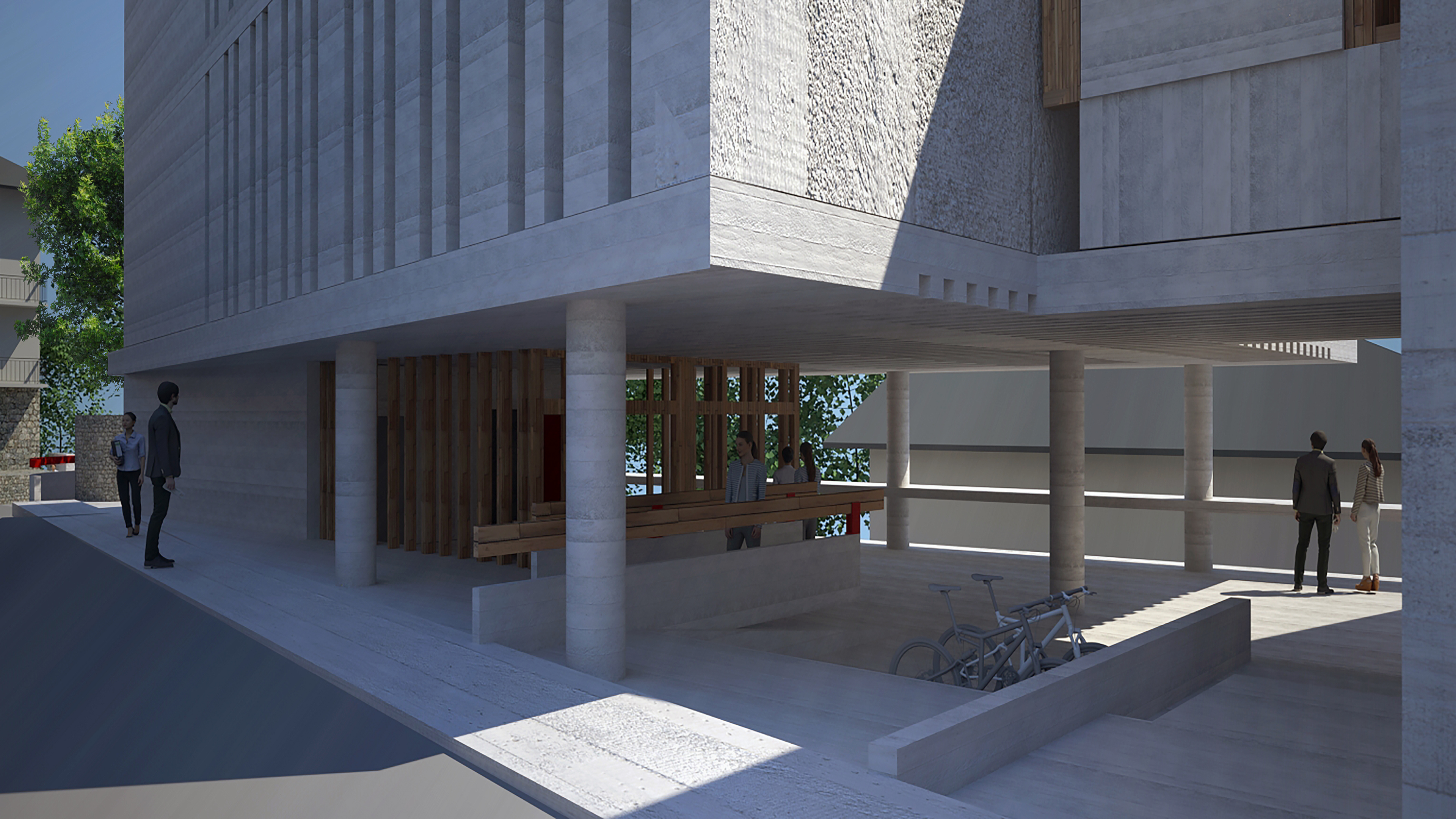 Il progetto prevede la demolizione dell’edificio esistente e la costruzione di un nuovo corpo di 4 piani (in seconda fase ridotti 3) oltre il basamento e il piano di ingresso, per una altezza massima di 16 metri (in seconda fase 14). L’impronta planimetrica a trapezio si struttura su di una maglia di pilotis e sul corpo scale in cemento armato. Rialzato e permeabile al piano terra, l’edificio è integrato e organico alla nuova piazza che, attraverso rampe e gradonate, permetto il raccordo delle diverse quote stradali e ne facilita la fruizione pedonale e l’attraversamento. Il basamento si configura come podio allungato sull’intero lotto di costruzione e assorbe lungo i suoi bordi il dislivello stradale. Contiene lungo la via Roma l’accesso carrabile al garage e al deposito. La forma circolare dell’apertura si rapporta alla linea obliqua del piano stradale. L’edificio, in forma di broletto, ha la cella di ingresso alla quota di contatto con la strada verso nord, assecondando quindi la passeggiata a scendere.”