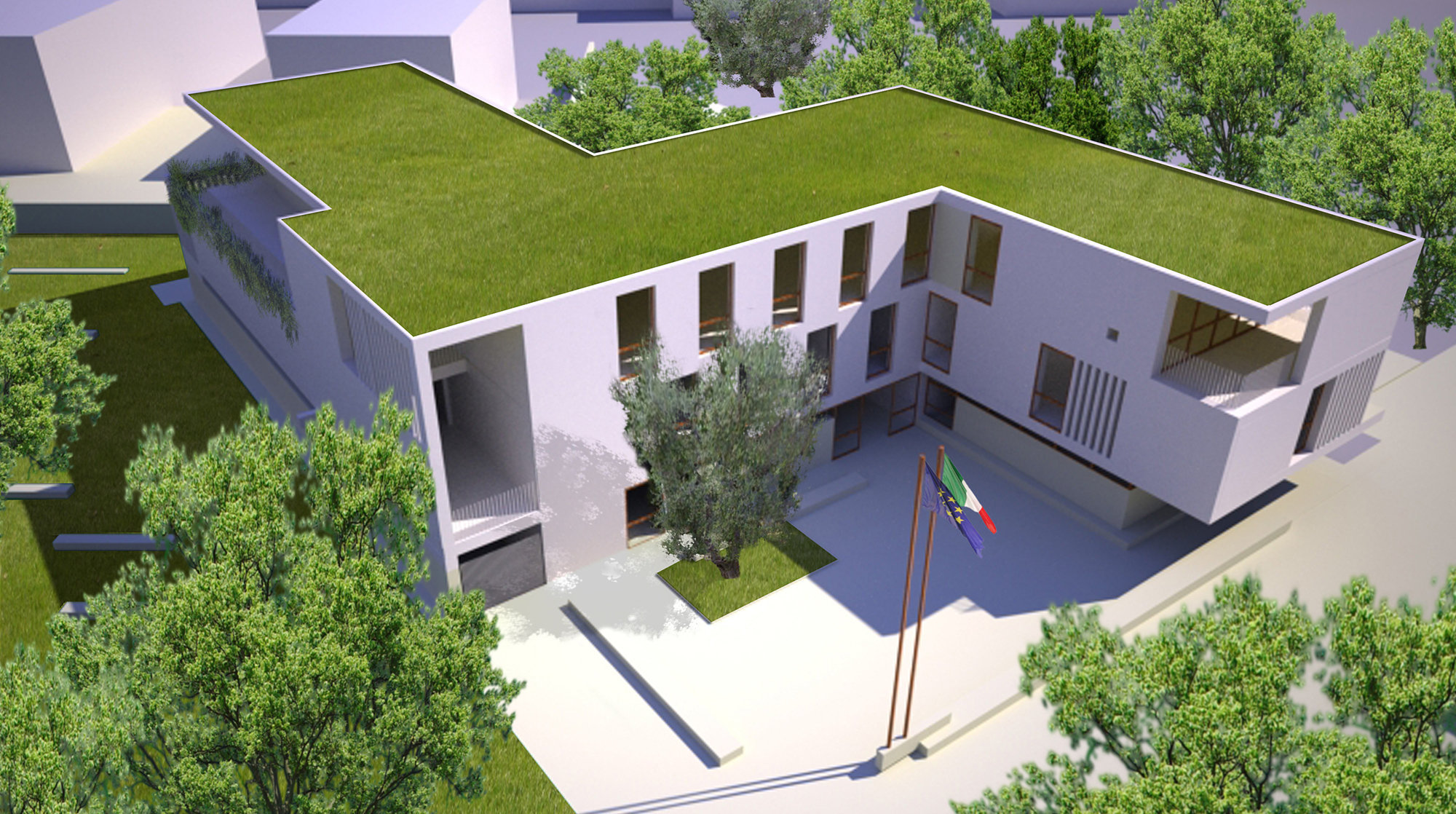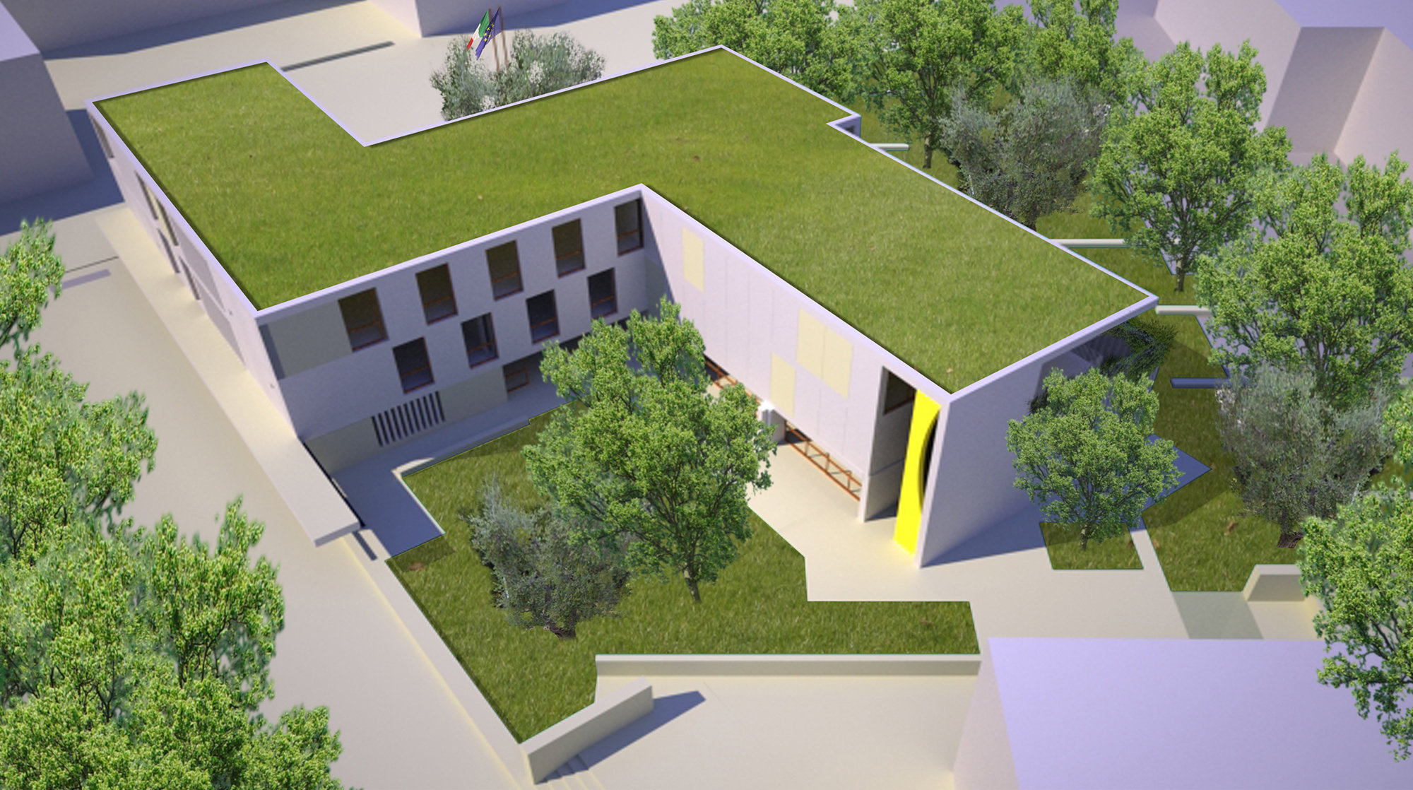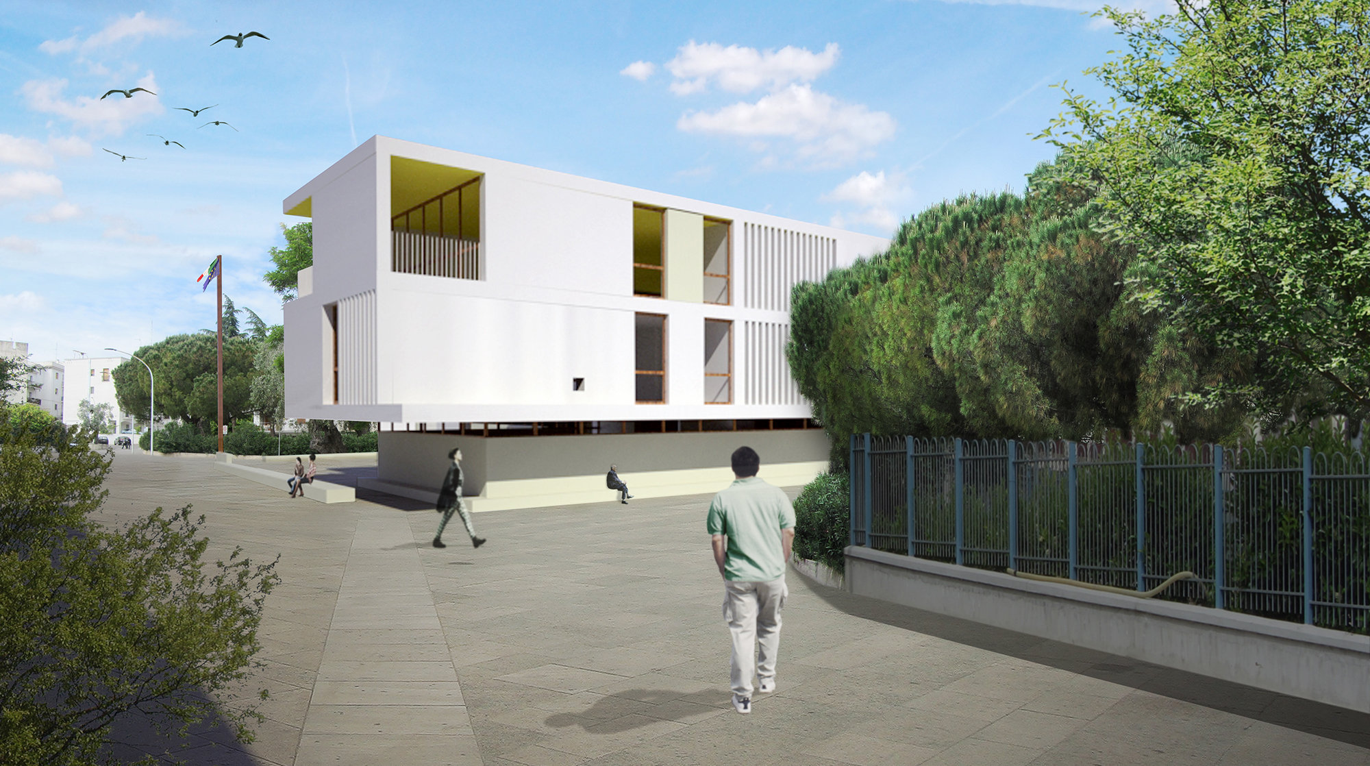 L’edificio è tutto circumnavigabile pedonalmente e lungo il suo perimetro si incontrano sedute continue, passaggi coperti, ingressi principali e secondari, ingressi generali e dedicati.