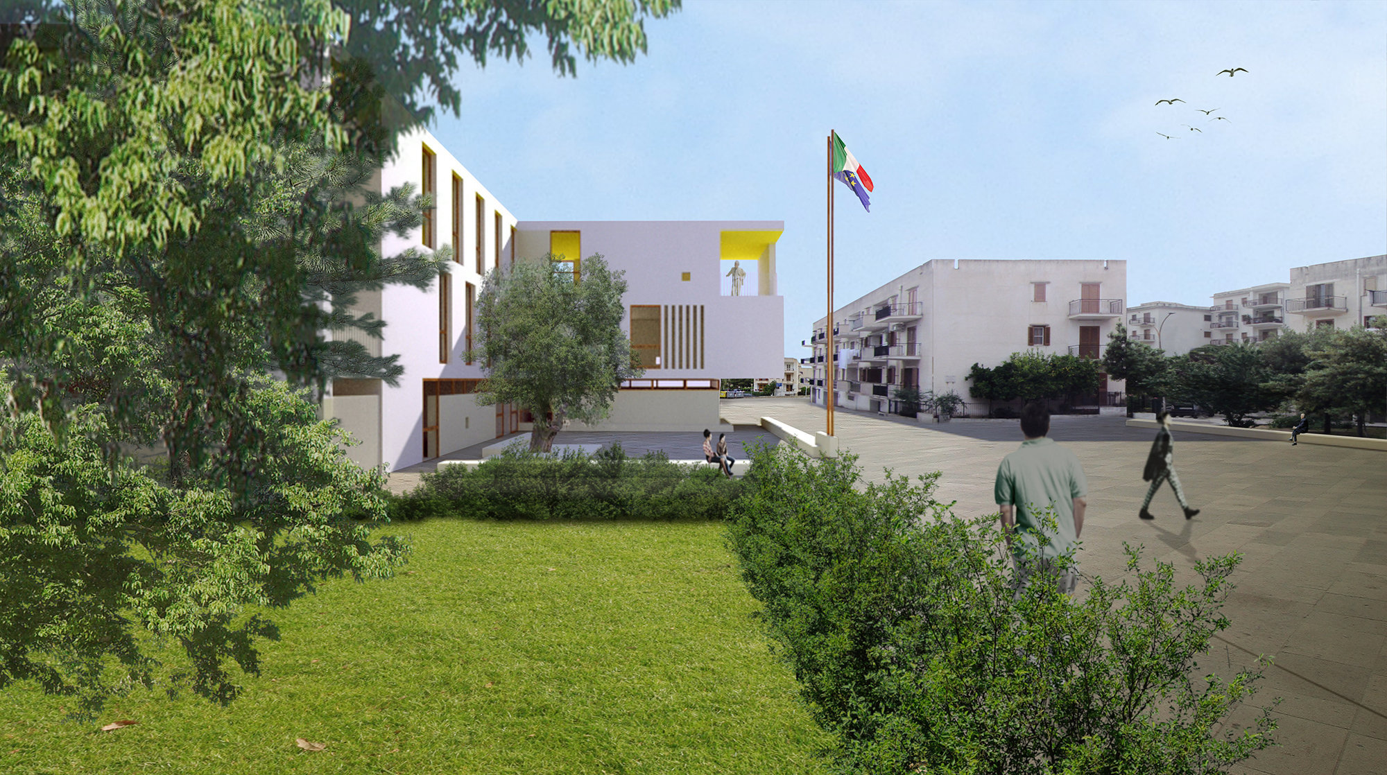 Mezzi di servizio possono utilizzare un’autorimessa al piano interrato collegata tramite rampa che si affaccia al bordo della piazza lungo la via Don Milani.