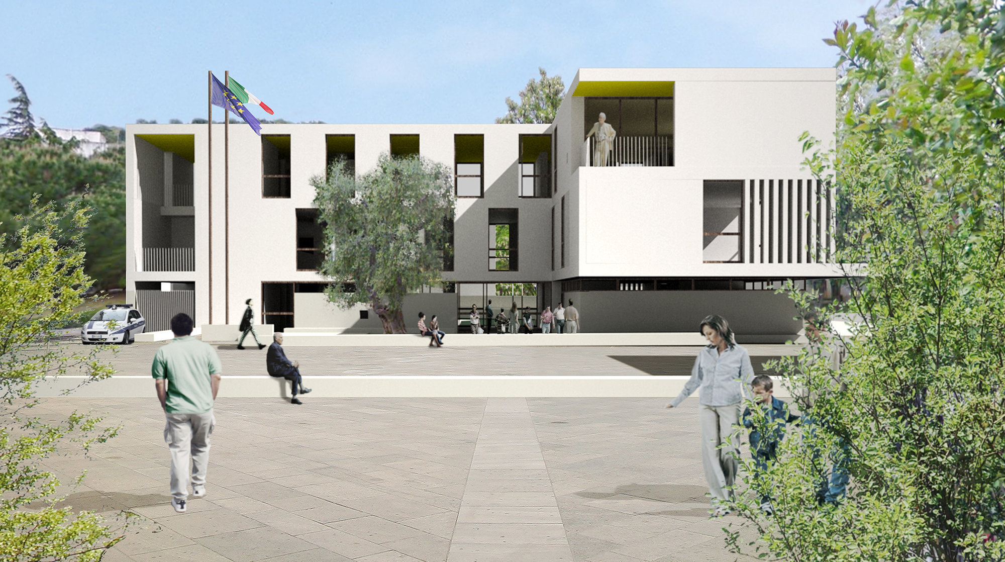 Un ascensore ed una scala esterni permettono di accedere autonomamente anche agli ambienti soprastanti la sala consiliare a doppia altezza. Ampie logge e terrazze, spazi fruibili e di mediazione tra esterno e interno, caratterizzano la volumetria complessiva che attraverso dilatazioni, scarti e aperture intende possedere un carattere di forte porosità, tettonica e metaforica.