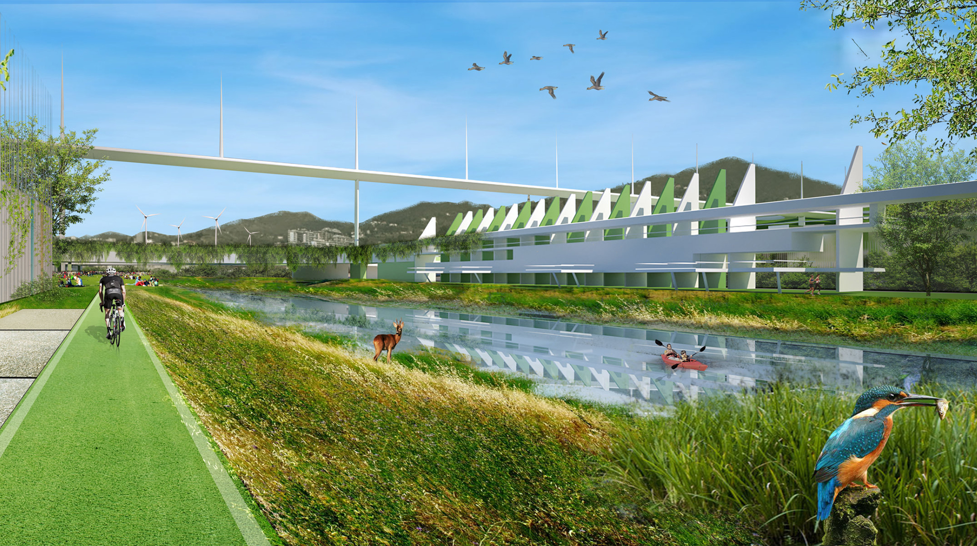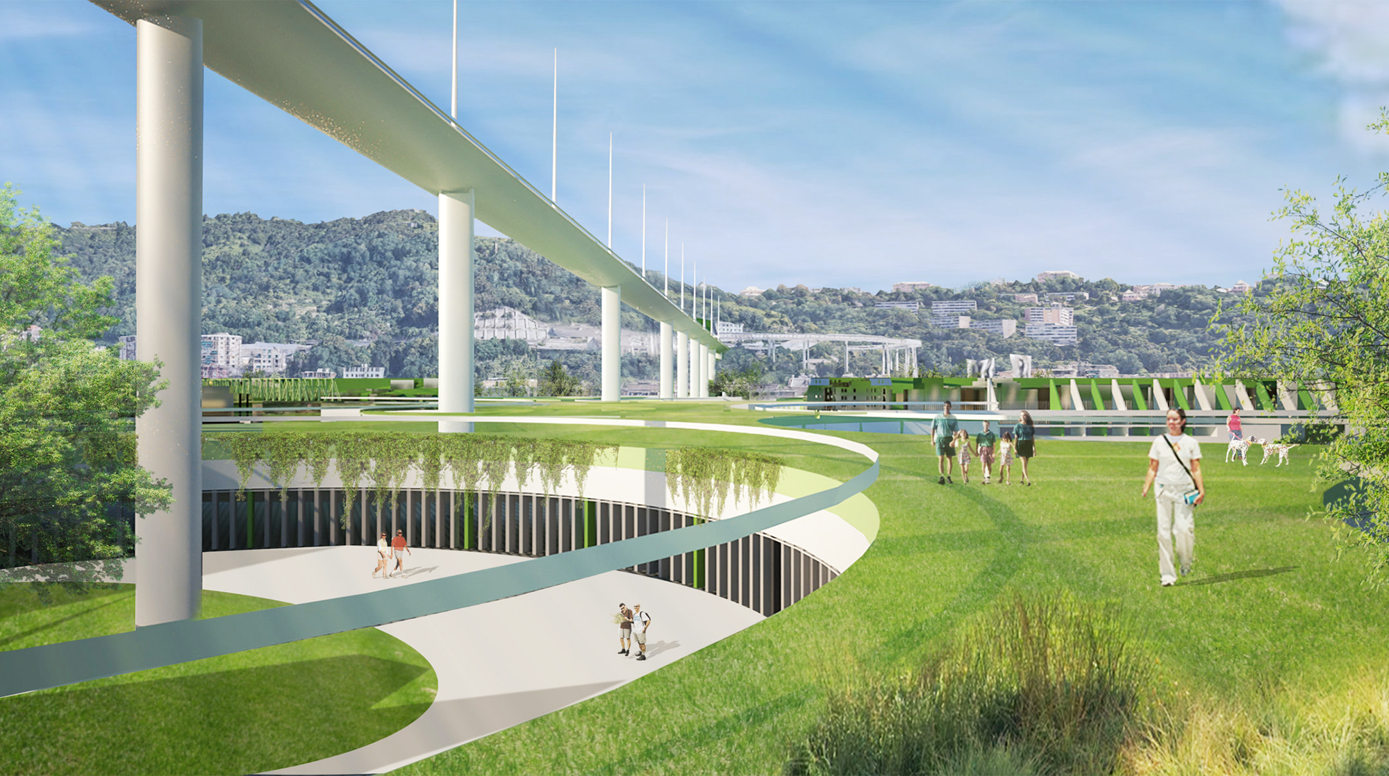 L’area del Polcevera presenta carattere di polverizzazione e di frammentazione che si intende ridurre attraverso la costruzione di un manufatto catalizzatore e unificatore: si è inteso risolvere il problema degli attraversamenti non attraverso una serie di misurati elementi infrastrutturali ma attraverso un unico grande parco pensile, esso stesso ponte e nuovo luogo di ospitalità collettiva.