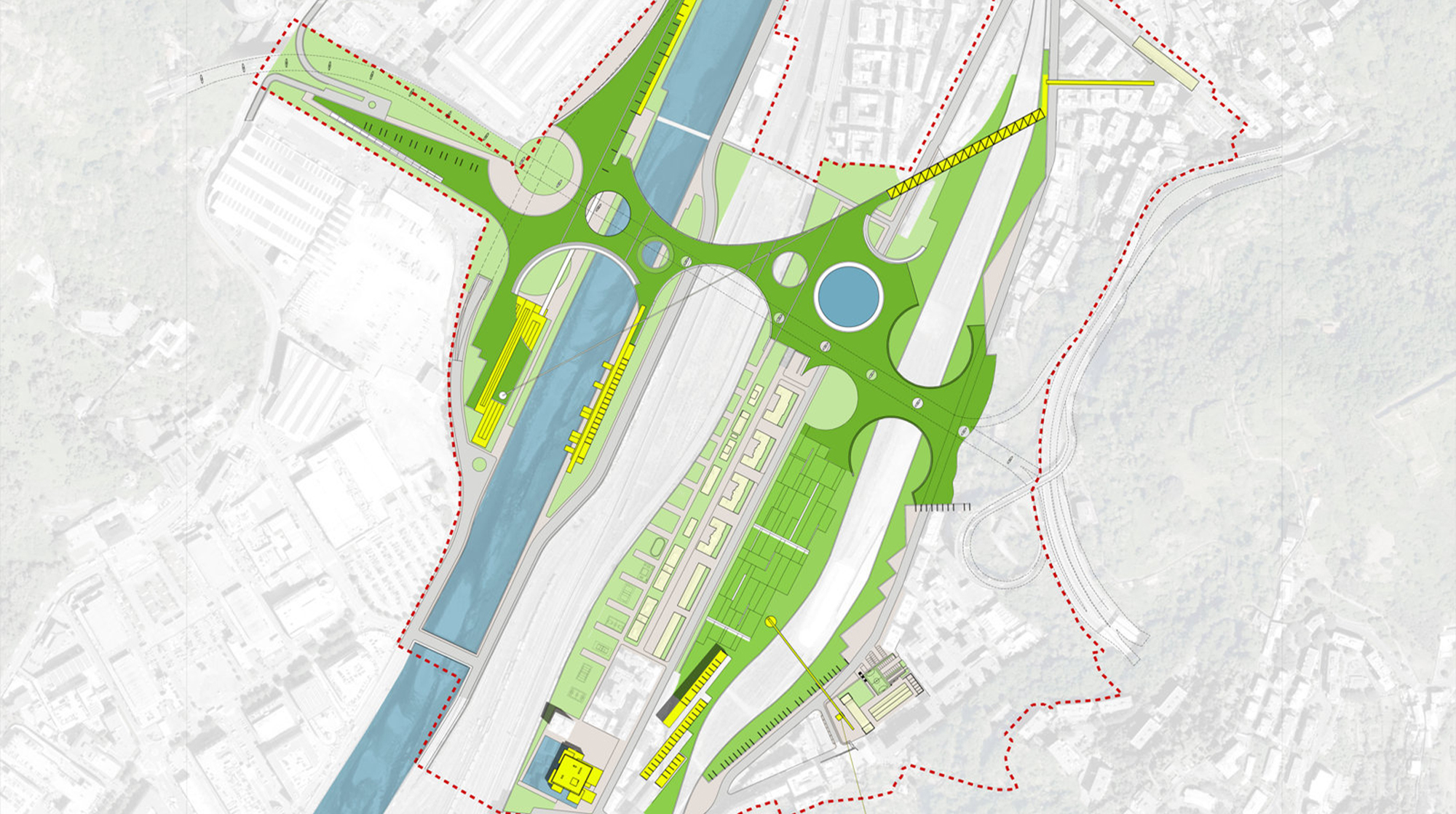 La necessaria connessione fisica tra i due versanti collinari - urbana, pedonale, ciclabile, diretta - viene garantita da un’unica struttura a ponte che permette il superamento di tutti gli elementi che attualmente costituiscono cesura o barriera fisica (strade, sedimi ferroviari, corso d’acqua). Si tratta di una piattaforma unica, con sezione di complessiva variabile tra 6 e 4 metri e intradosso a più 7,5 m dal piano stradale-ferroviario medio. Si costituisce ovvero un secondo piano di campagna in elevazione, attraverso riporti di terra e strutture in cemento armato, avente carattere di parco, di ponte, di architettura del paesaggio al tempo stesso.